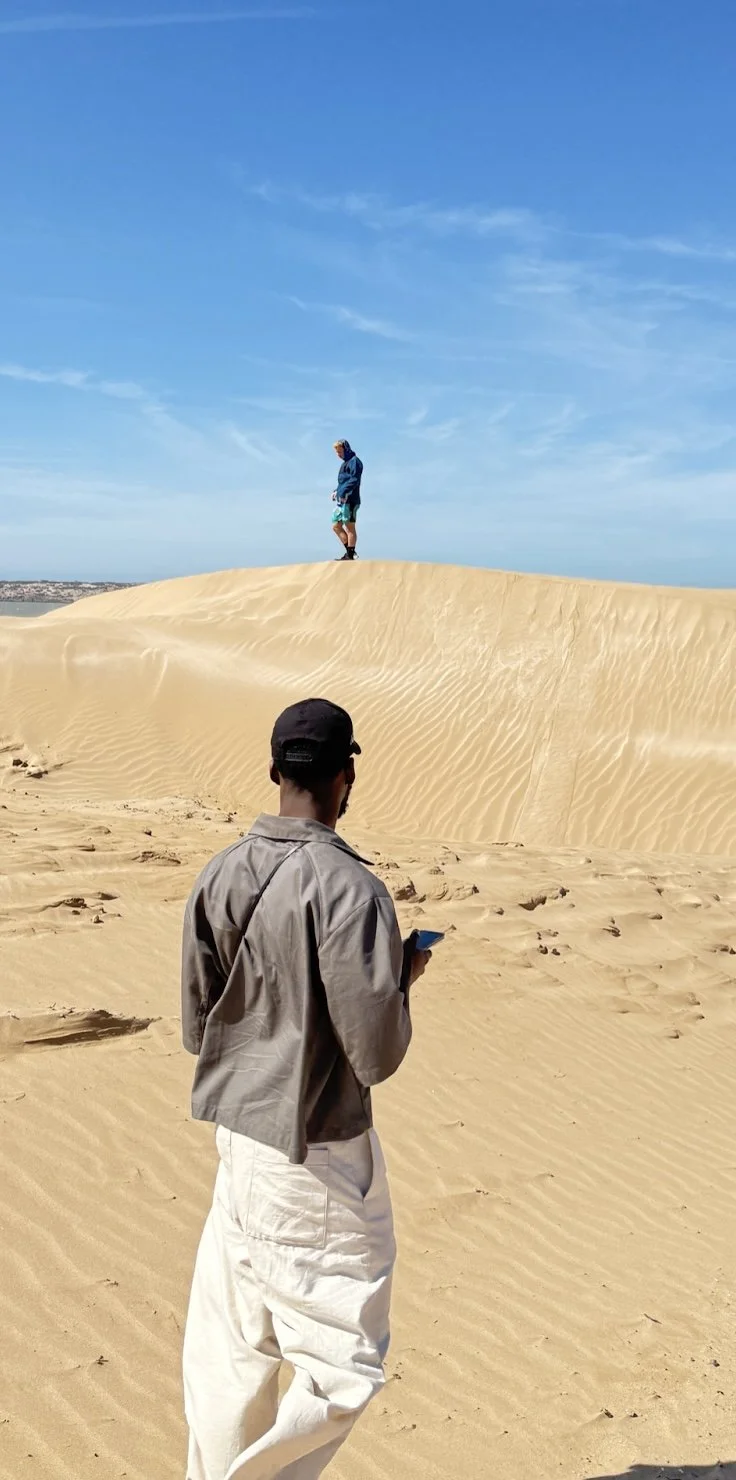 The first segment was captured within the sand dunes of Essaouira, where three models moved through the landscape in synchronised motion.